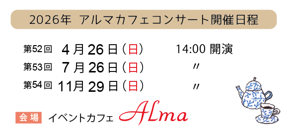 〔キャンセル料金(2026年改定)〕 A)申込受付日から2週間までのキャンセル・・・無料 B)申込受付日から2週間後〜開催2週間前のキャンセル・・・1000円(※) C)開催2週間前から2日前の18時まで…2000円(※) D(前日当日キャンセル・・・全額・振替不可(参加費はお振込みください) 〔上記のBとC…次回開催へ振替が可能です。〕 予約をしているが、ご都合が悪くなった場合、キャンセルか次回振替かをお選びいただけます。 但し、振替の場合、その振替分がキャンセルになった時も全額の参加費が発生します。 当日キャンセルは振替はできません。 ![]() * 備品 簡易PAシステム/マイク/マイクスタンド/譜面立ては用意しています。 (利用は無料です。マイクをご利用の方は、事前にお知らせください。) * ピアノ伴奏について 伴奏者は基本、各自お連れください。 伴奏者が見つからない場合は、内容によって承っています。 ※合わせが1、2回の練習では難しい曲(ソナタや協奏曲、現代曲などのピアノパートが難解なもの)は承れないことがあります。 伴奏費は当日伴奏費用 1曲 2000円〜5000円、2曲3000円〜6000円程でお引き受けしています。 (難度やページ数によって変わります。) 伴奏合わせの事前練習は別途2000円(会場費含む/30分程度)で承っております。 ピアノ伴奏譜(もしくはコード譜)を事前にご用意ください。 * 音源伴奏で演奏または歌われる方 CD、外部入力での再生が可能です。(会場側で操作OK) * 当日のリハーサル 当日は同ビル2F 和光音楽アカデミーの練習室を2部屋程、リハーサル室に開けています。 12:00〜13:50頃まで、一組10分以内、交代でご利用いただけます。(無料) 1Fのアルマ(コンサート会場)は13:30まで、順番でリハーサルいただけます。 * その他 ・演奏は2時間から2時間半ほどです。2部構成で途中に10分程の休憩が入ります。 ・駐車場はお近くのコインパーキングをご利用ください。 * お客様 ・予約不要です。お一人500円いただいています。 (お子様も500円が必要です) ・乳幼児もご入場いただけますが、演奏の妨げにならないようにご配慮ください。 ・途中入場もOKですが、演奏と演奏の間にお入りください。 ・演奏者の許可のない録音録画は出来ません。 ![]() 2026年 アルマカフェコンサート 開催日程