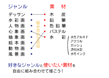 「ジャンル」 デッサン・水彩画・人物画・抽象画・心象画・絵本画 「素材」 木炭・鉛筆・色鉛筆・パステル・ 水彩(水性アルキド・アクリル・ガッシュ・透明水彩・水性インク) 好きなジャンルと使いたい素材を自由に組み合わせてレッスン。 個別レッスンなので、各自のペースに合わせ、着実な上達。 |