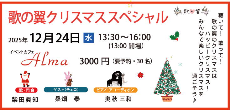 2025年、2026年もみんなで楽しくにぎやかに歌いましょう♪ ※通常イベントは予約不要。 スペシャル歌声は予約が必要です。 歌の翼 2025年のラストはクリスマススペシャル!! ご来場お待ちしております♬ ![]() 残り8枠程です(2025年12月14日現在) どなたでも気軽に参加ください♬予約制となっております。お電話等でお申し込みください。 キャンセル料金は不要ですが、予約のキャンセルはできるだけお早めにお願いいたします。 ![]() |